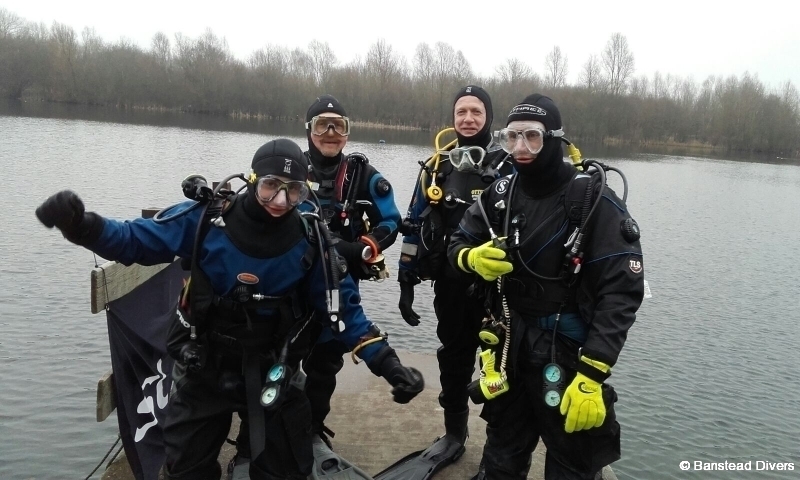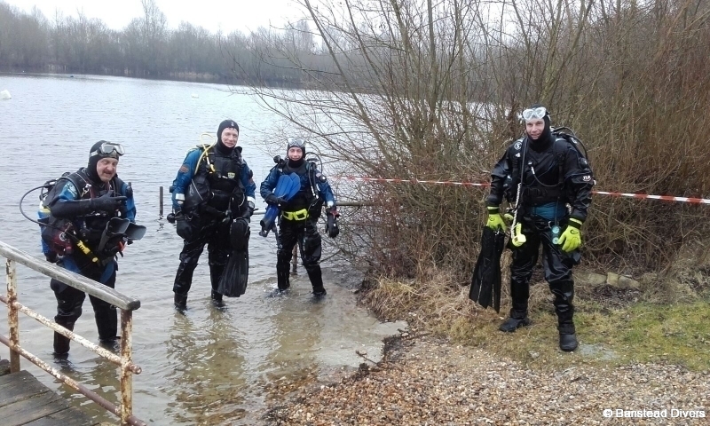 Undeterred (and under no pressure) we readied for Dive 2, which for Owen included replacing five layers of damp t-shirts for five new dry ones, which, with the addition of a Thinsulate made him look like he had eaten too many bacon sarnies during the surface interval. Step-entry this time and another successful dive touring the sunken treasures of Wraysbury, (for both dives the water temp measured at 5°) without Julian this time as he had decided one trip was sufficient for the day and land cover (and warmth) was far more important. Had a little fun going through the cabin of the Elizabeth Austin lifeboat and the Pipe and then, before you knew it, we were back at the shore having completed the second dive (30 mins/8m max depth). Taking kit off in my opinion is the hardest part of the day and thanks to Julian (I think) for disassembling the gear for us to make packing up that bit easier. We might even go back.
