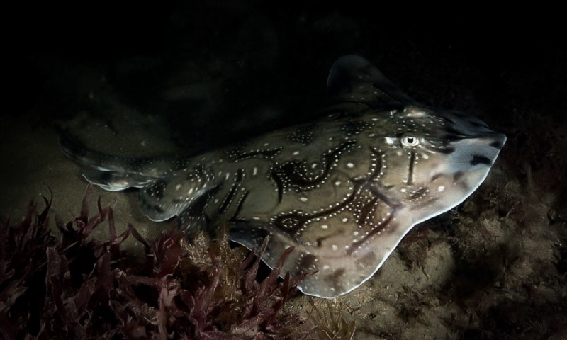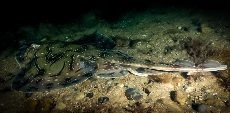 Paul and I decided to do a night dive at Chesil Beach. It’s a completely different dive to daytime. So much life comes into the sand flats at night. Undulate Rays were our target and we saw two in a short space of time.